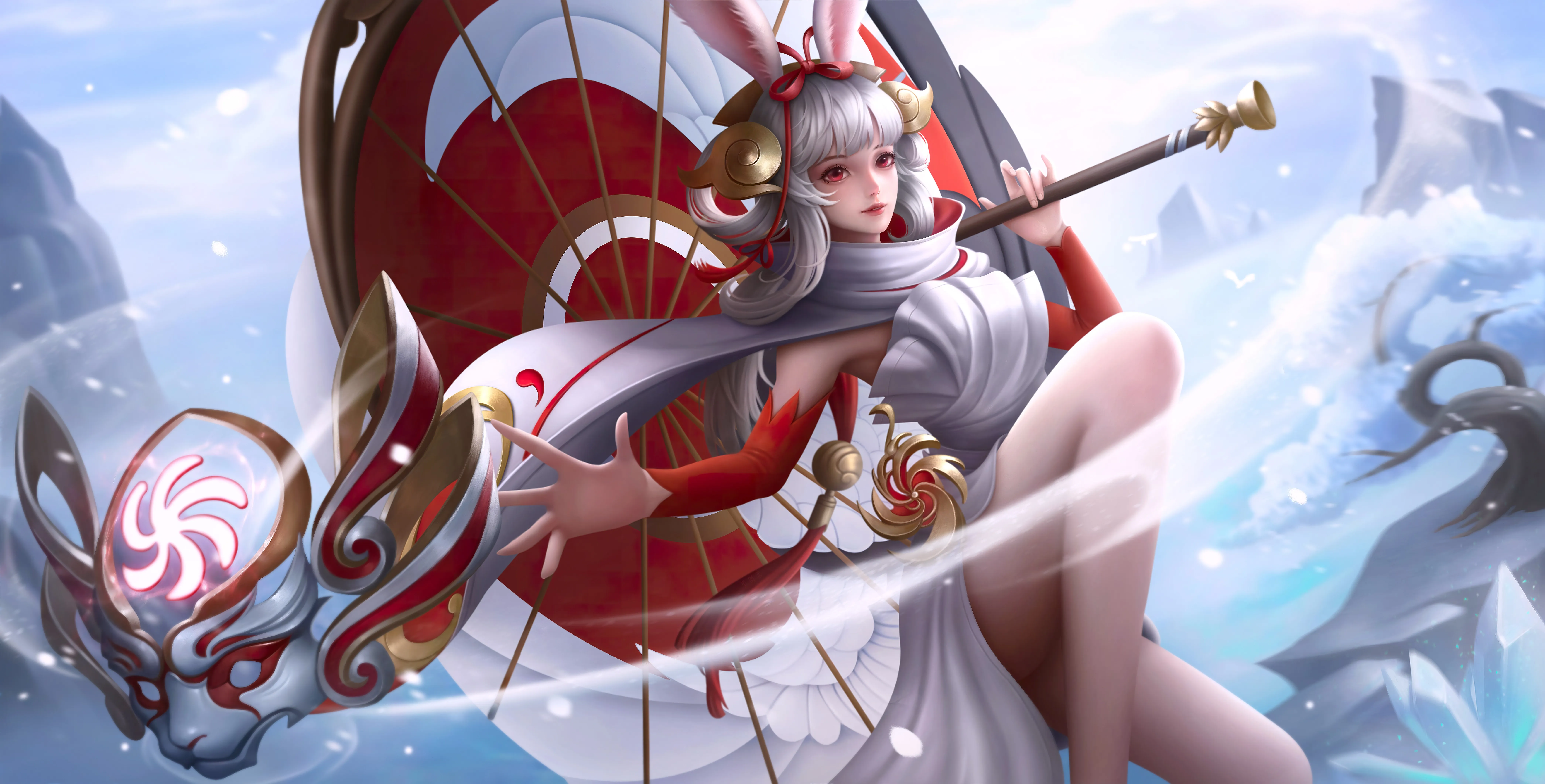 红眼 奇幻女孩 长发 王者荣耀 电子游戏 女孩 奇幻艺术 兔子耳朵 兽耳 兔子女孩 雨伞 8K壁纸