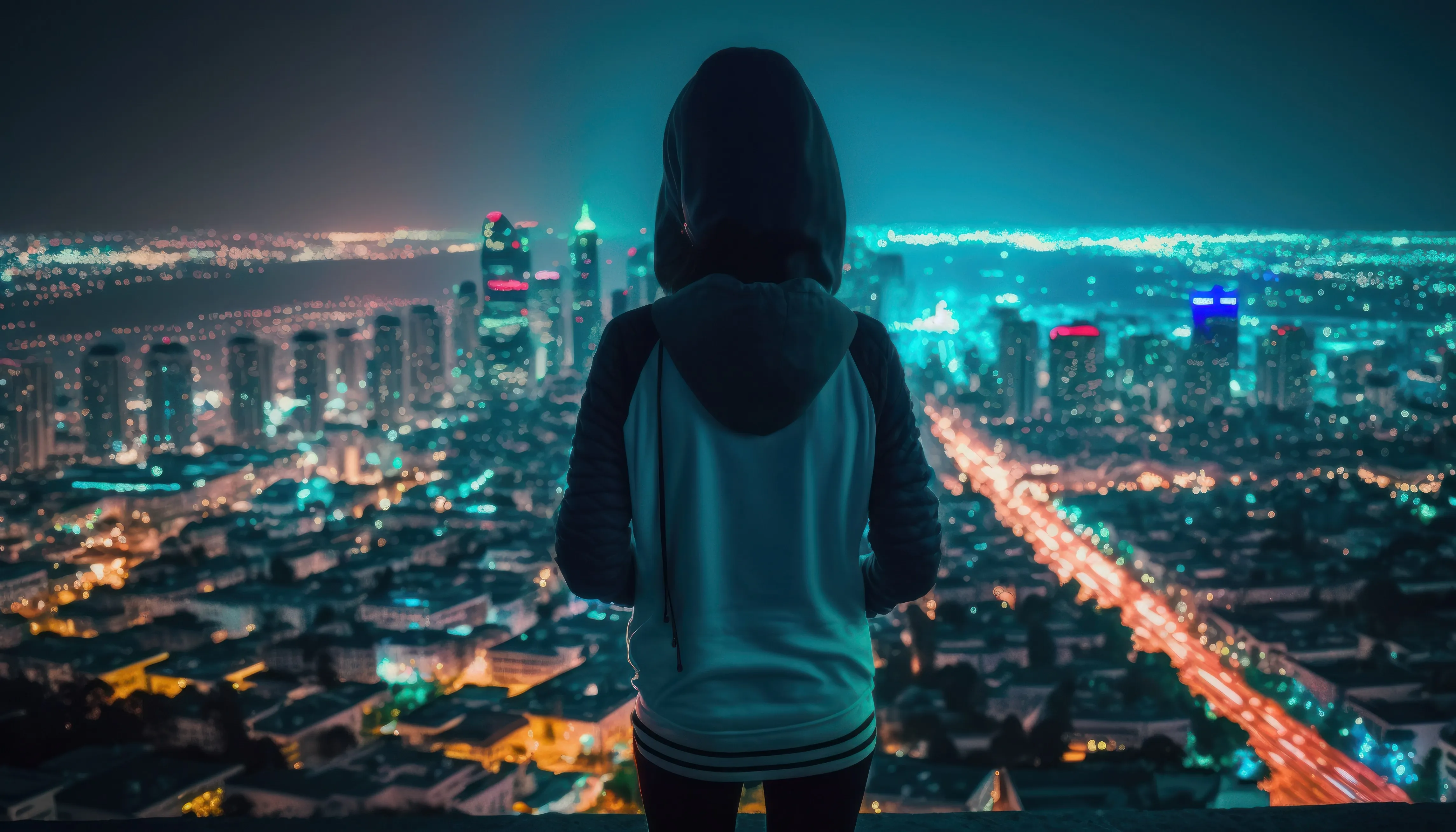 女性 艺术 城市 天际线 夜晚 城市灯光 青色 城市景观 引擎盖 4k壁纸