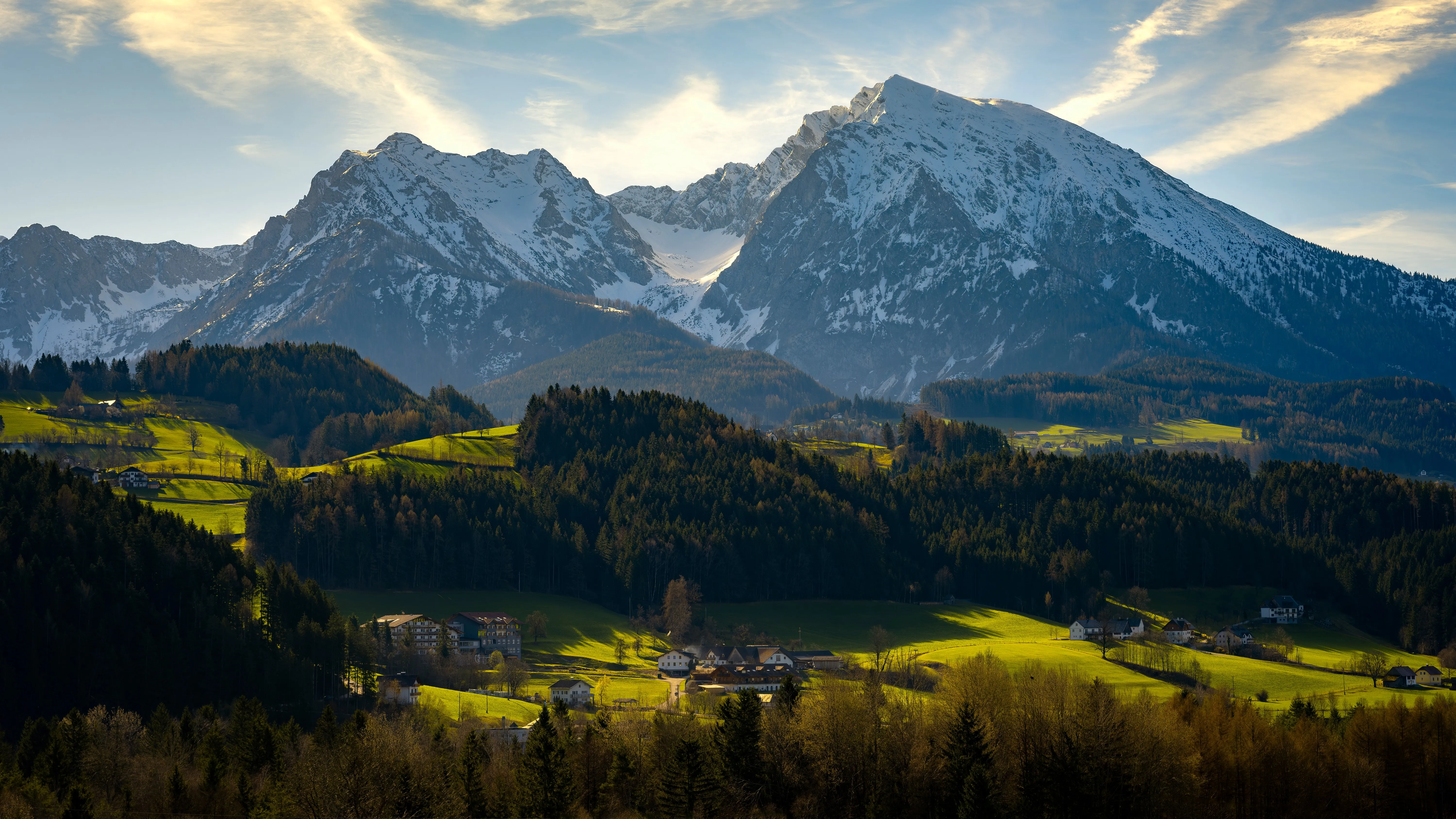自然 景观 树木 森林 天空 云 阳光 房屋 建筑 山 雪 草 山丘 村庄 4k壁纸