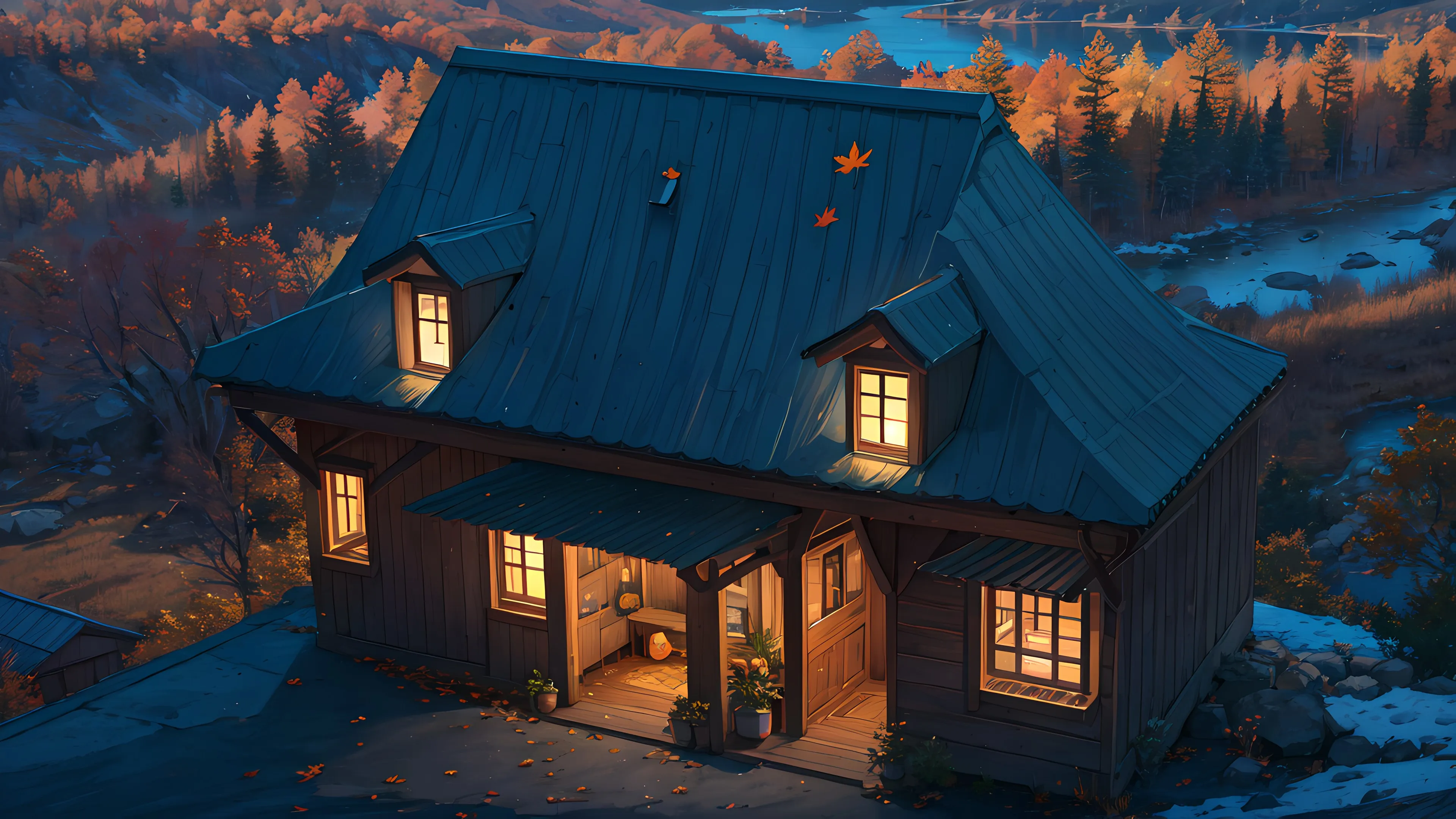 创意独特美4K艺术风景夜 枫叶 房子 电脑手机壁纸