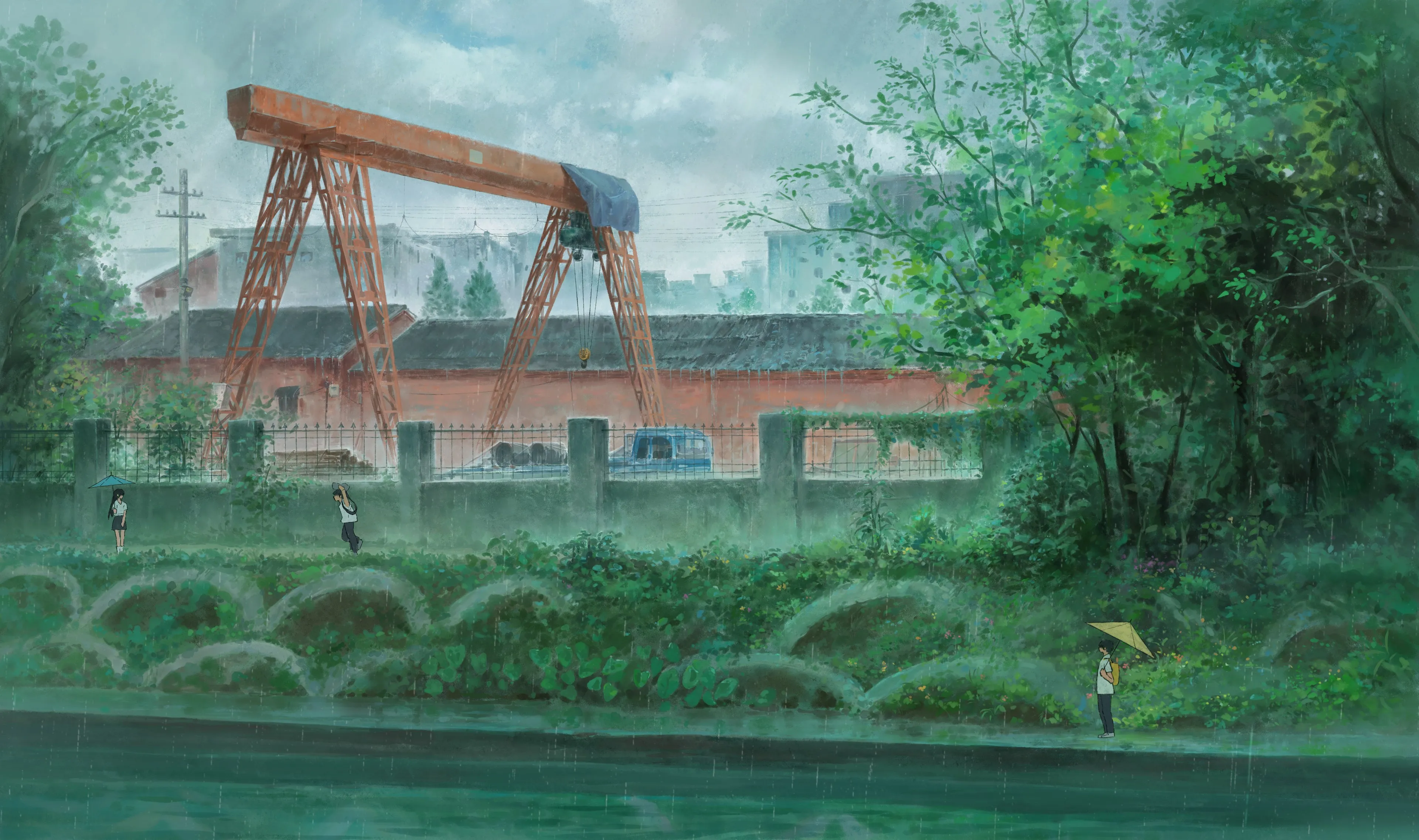学生 打伞 男孩 女人 女孩 学生 下雨 植物 自然风景 起重机 雨 河 阴天 4k壁纸