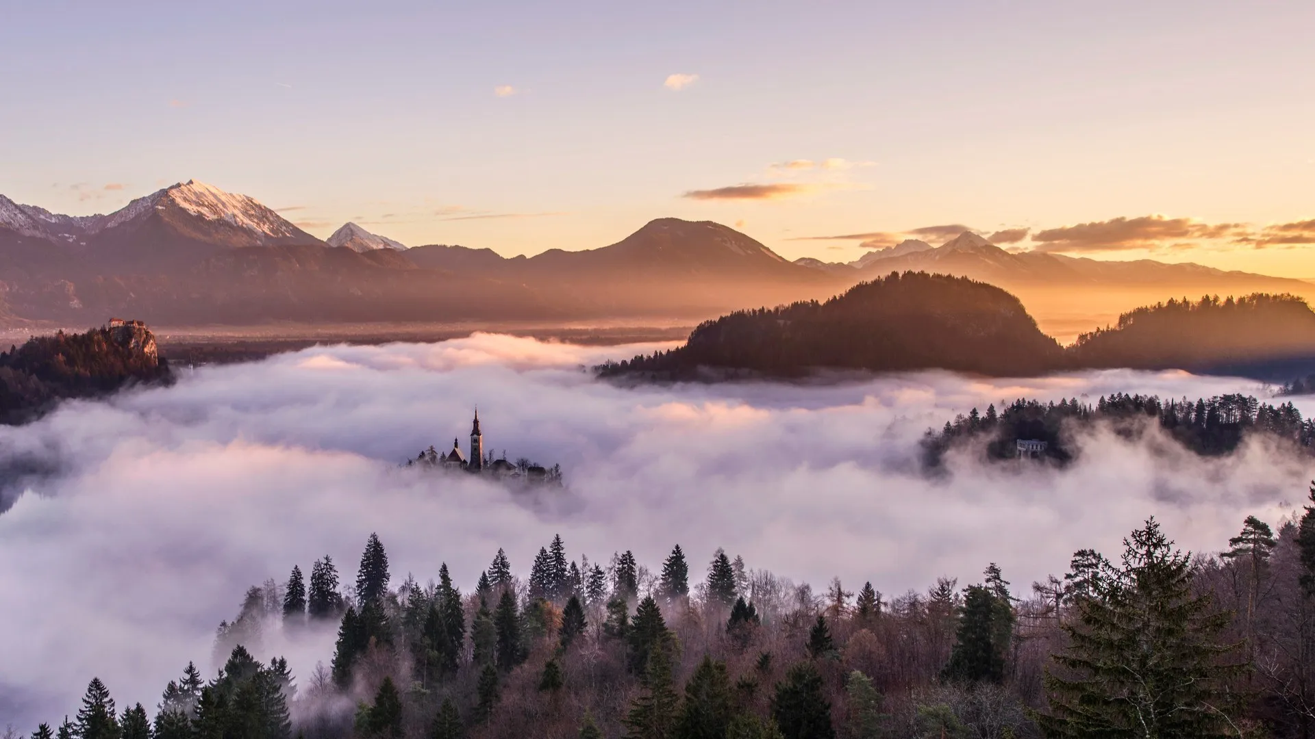 薄雾 风景 山脉 天空 教堂 森林 雪峰 摄影 斯洛文尼亚 树木 布莱德湖 岛屿  电脑壁纸 4k壁纸