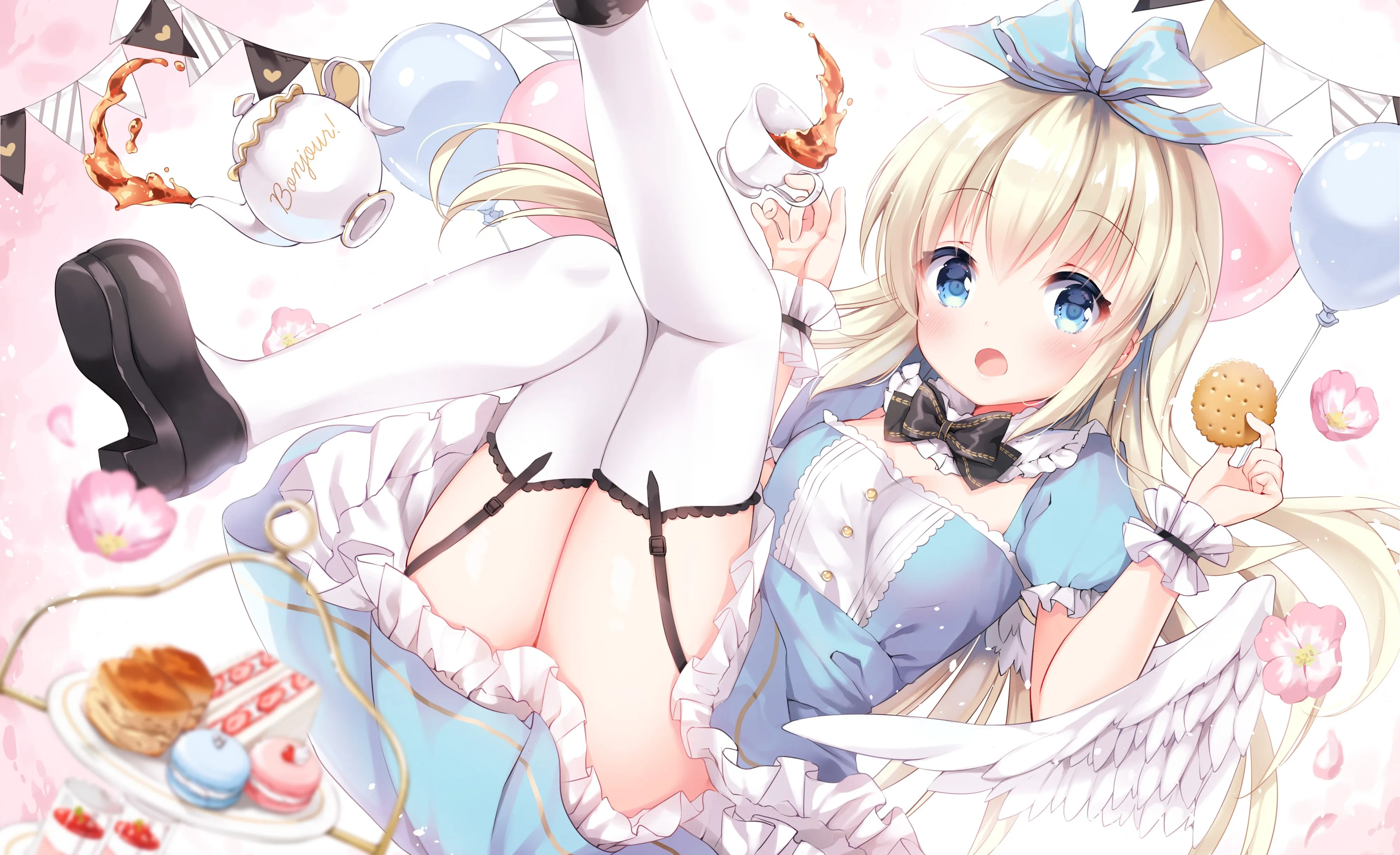 长发 大腿 金发 蓝眼睛 角色 动漫 女孩 吊袜带   连衣裙 翅膀 兽耳 萝莉 桌面壁纸 4k壁纸