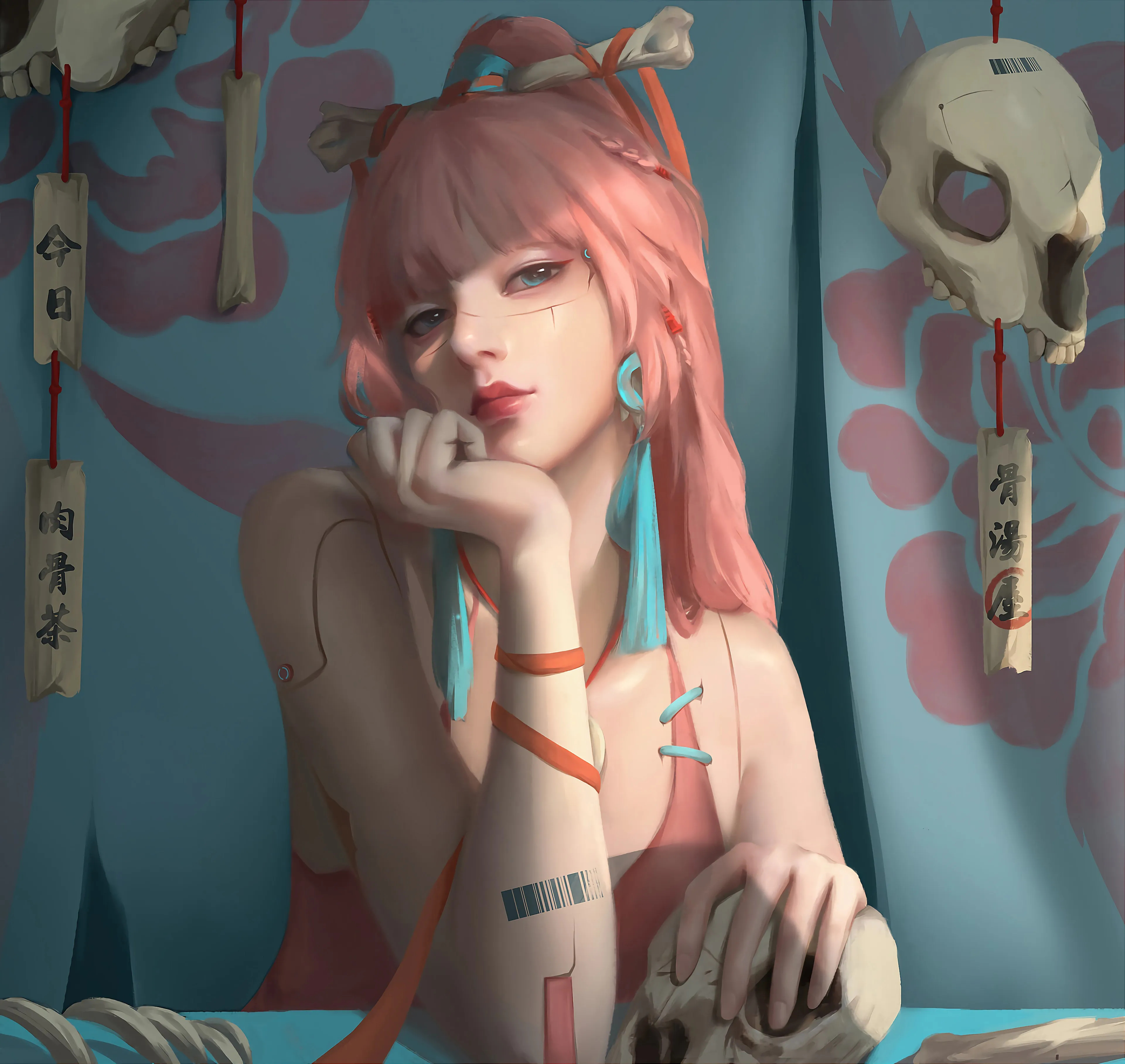 女人 长发 粉色头发 蓝眼睛 春秋 骨架 4k壁纸