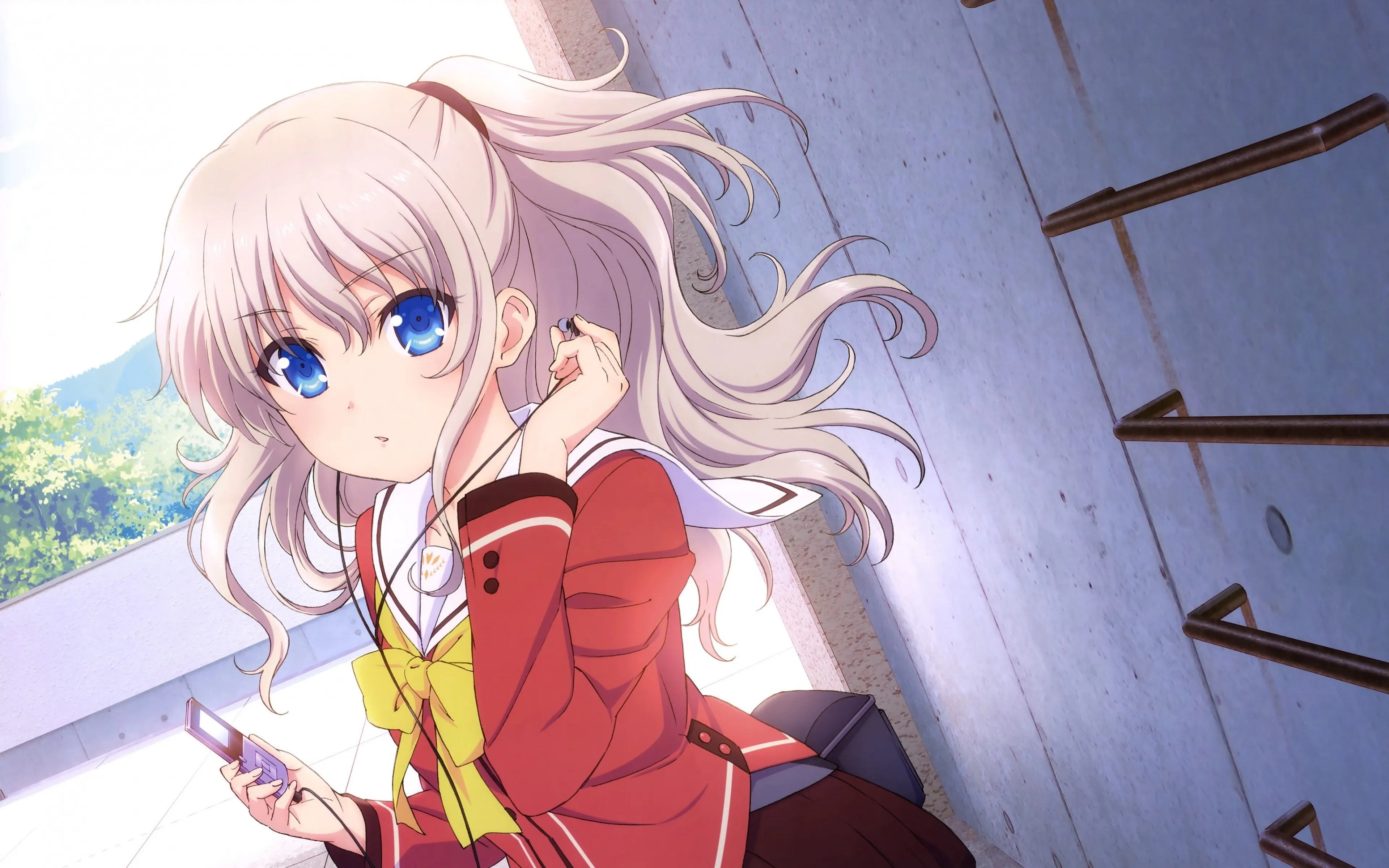 蓝眼睛 长发 户外女性 动漫女孩 动漫  动漫 校服 耳机 红色衣服  4k壁纸