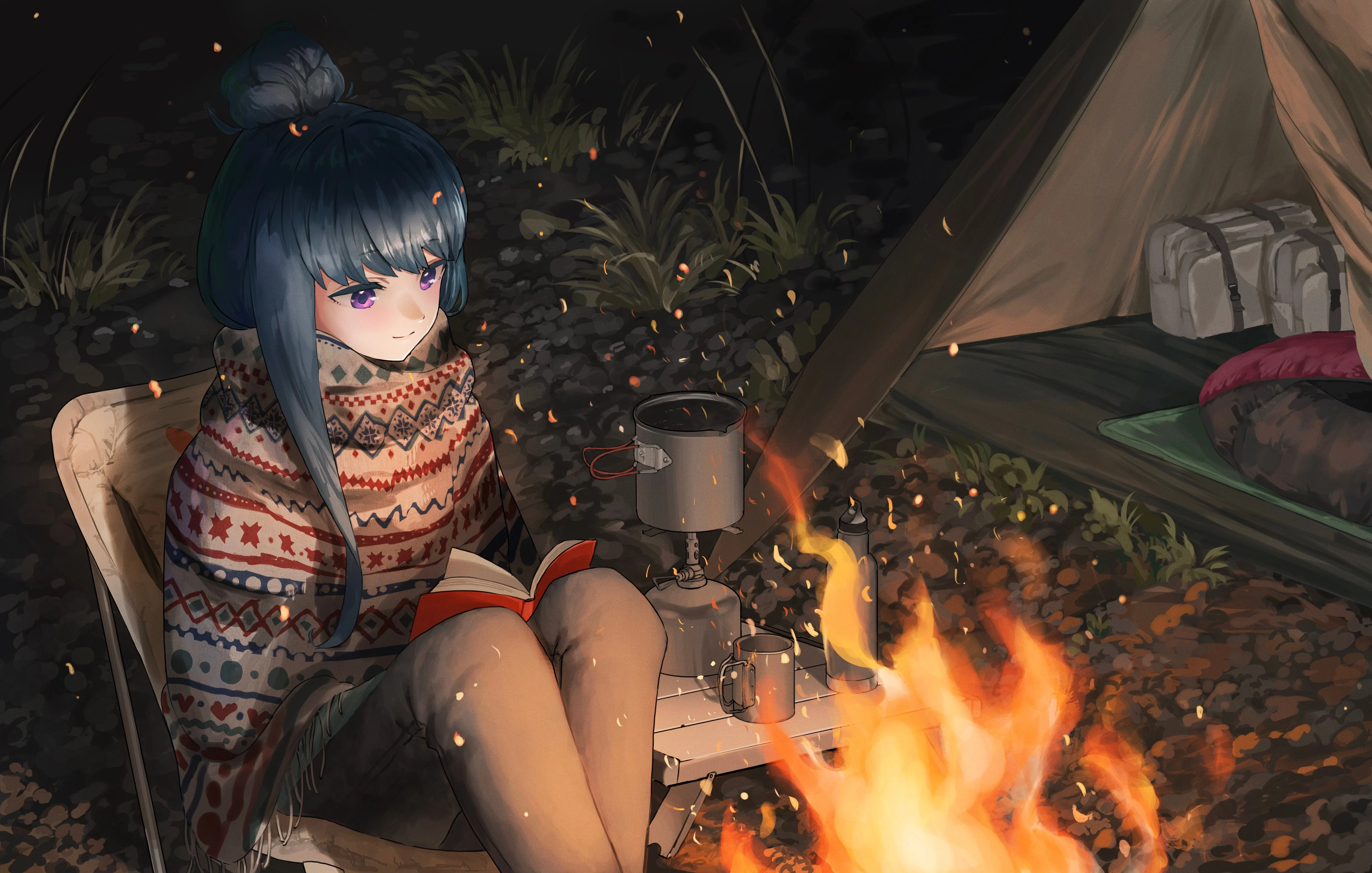 女人 蓝头发 动漫女孩 火 篝火 帐篷 露营  4k壁纸