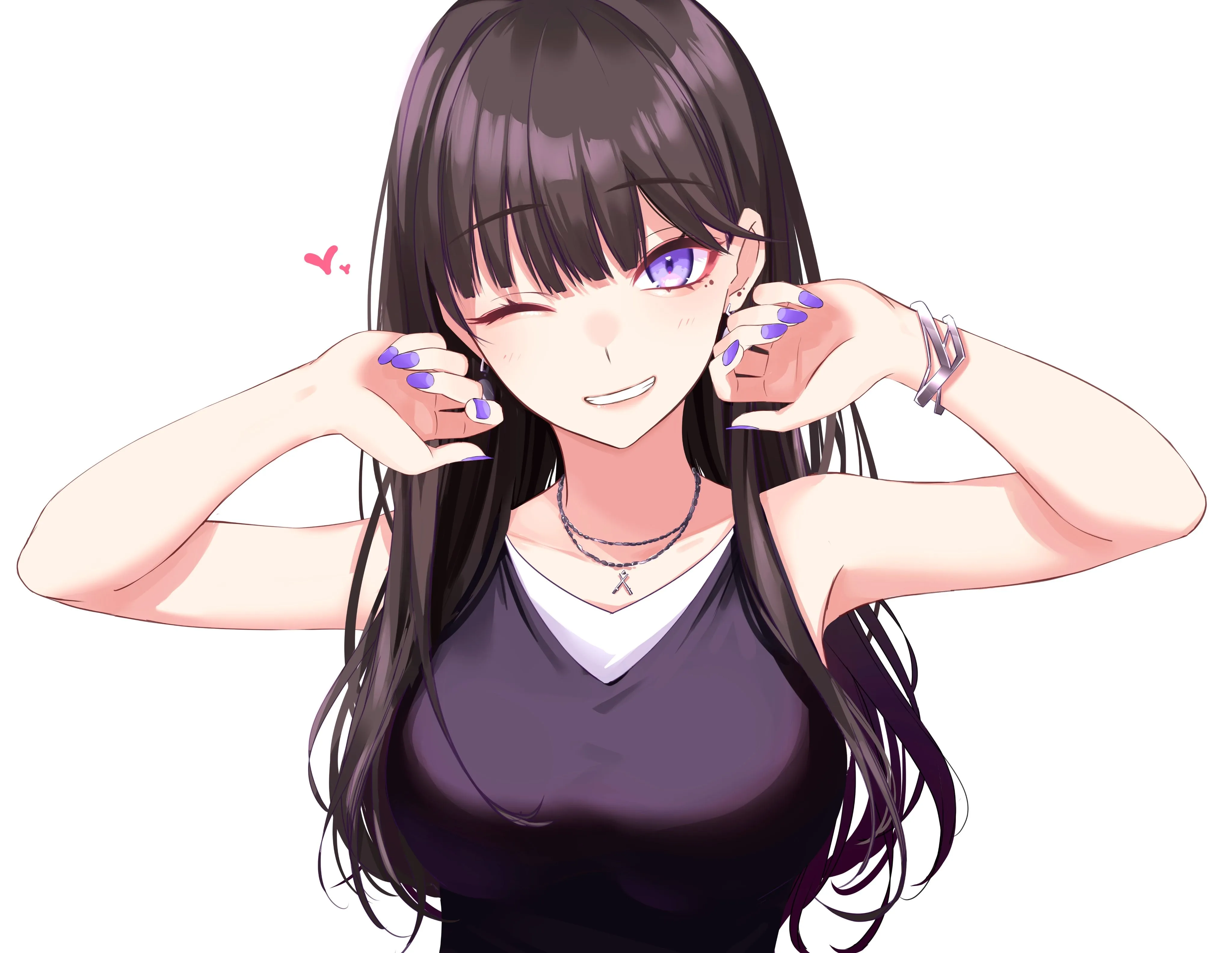 微笑 深色头发 长发 白色背景 动漫女孩 眨眼 紫色眼睛 4k壁纸