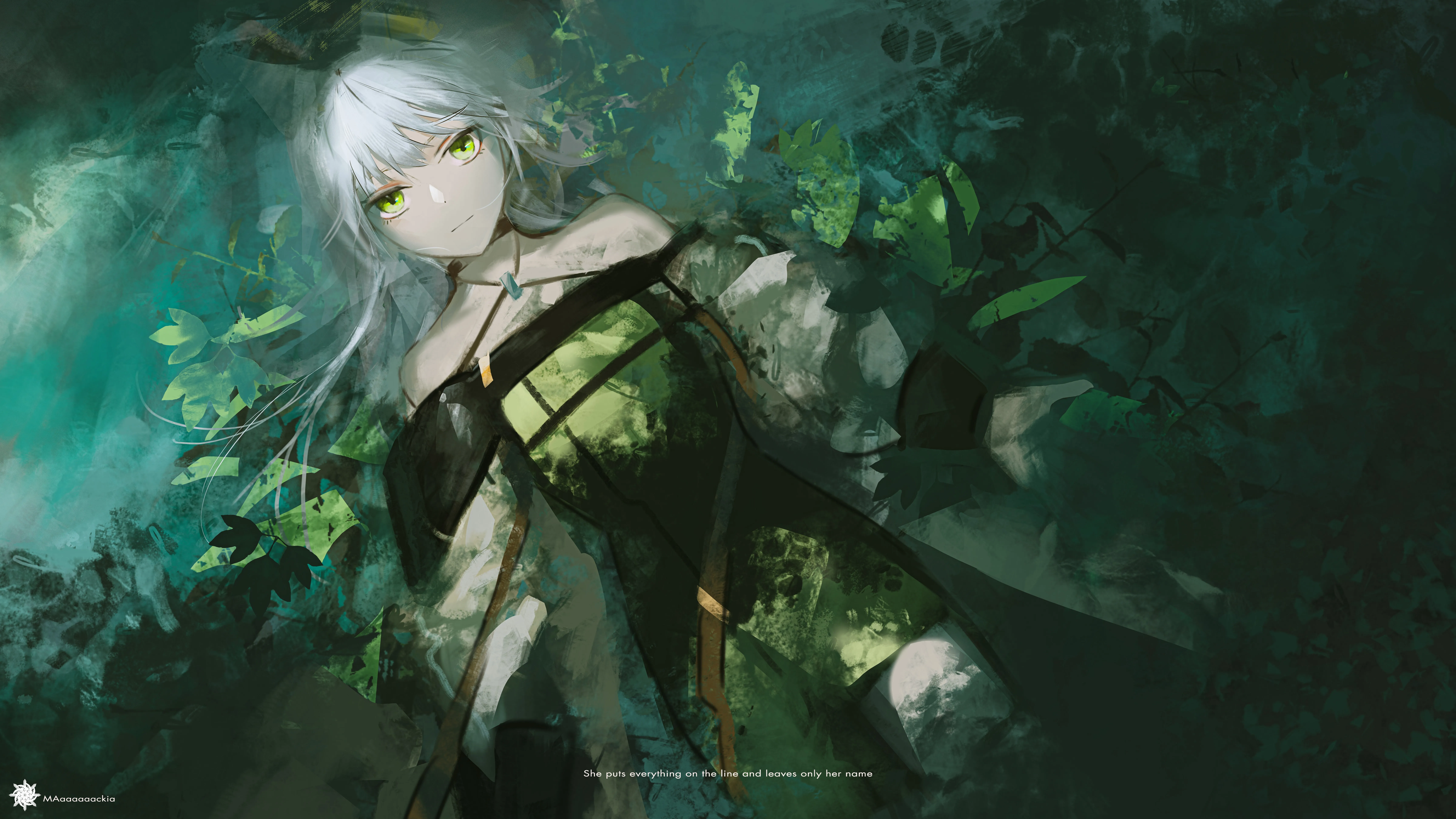 长发 绿色眼睛 白色头发 躺下 仰卧 动漫 动漫女孩 明日方舟 水 水中 树叶 8K壁纸