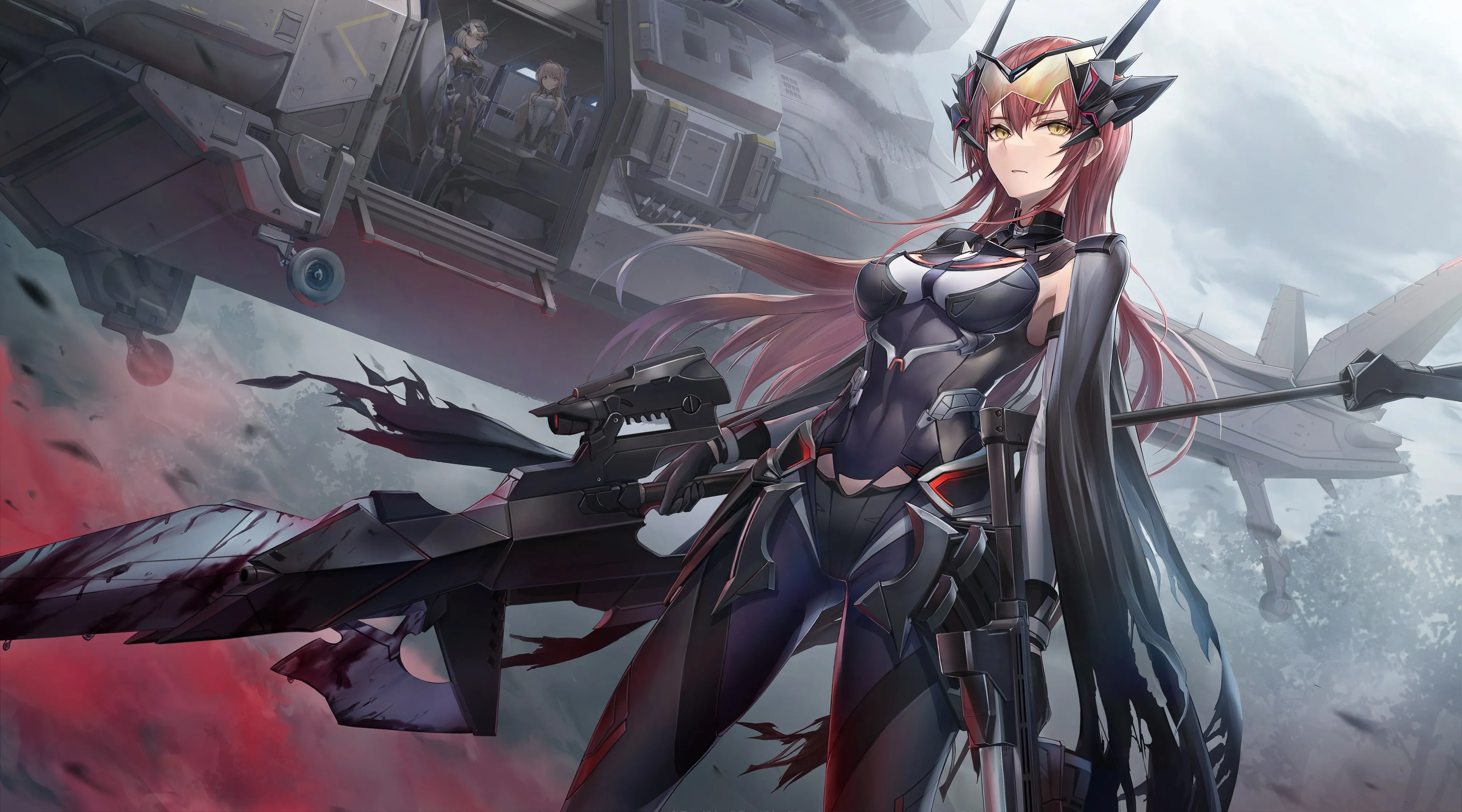 站立 长发 红发 动漫 动漫女孩 黄眼睛 汽车 紧身衣 直升机 武器 4k壁纸