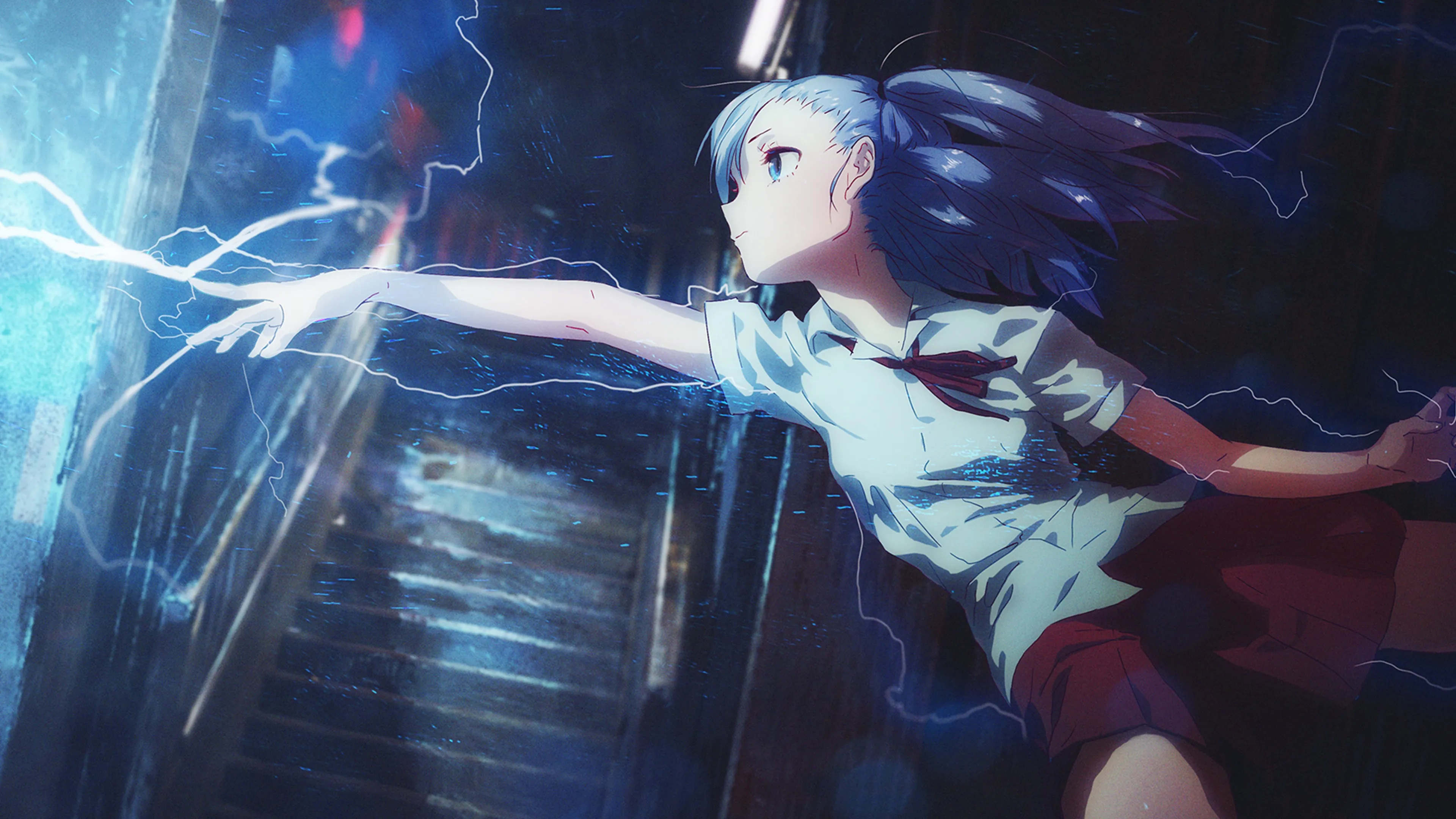 原创 人物 蓝头发 蓝眼睛 动漫 女孩 闪电 校服 4k壁纸