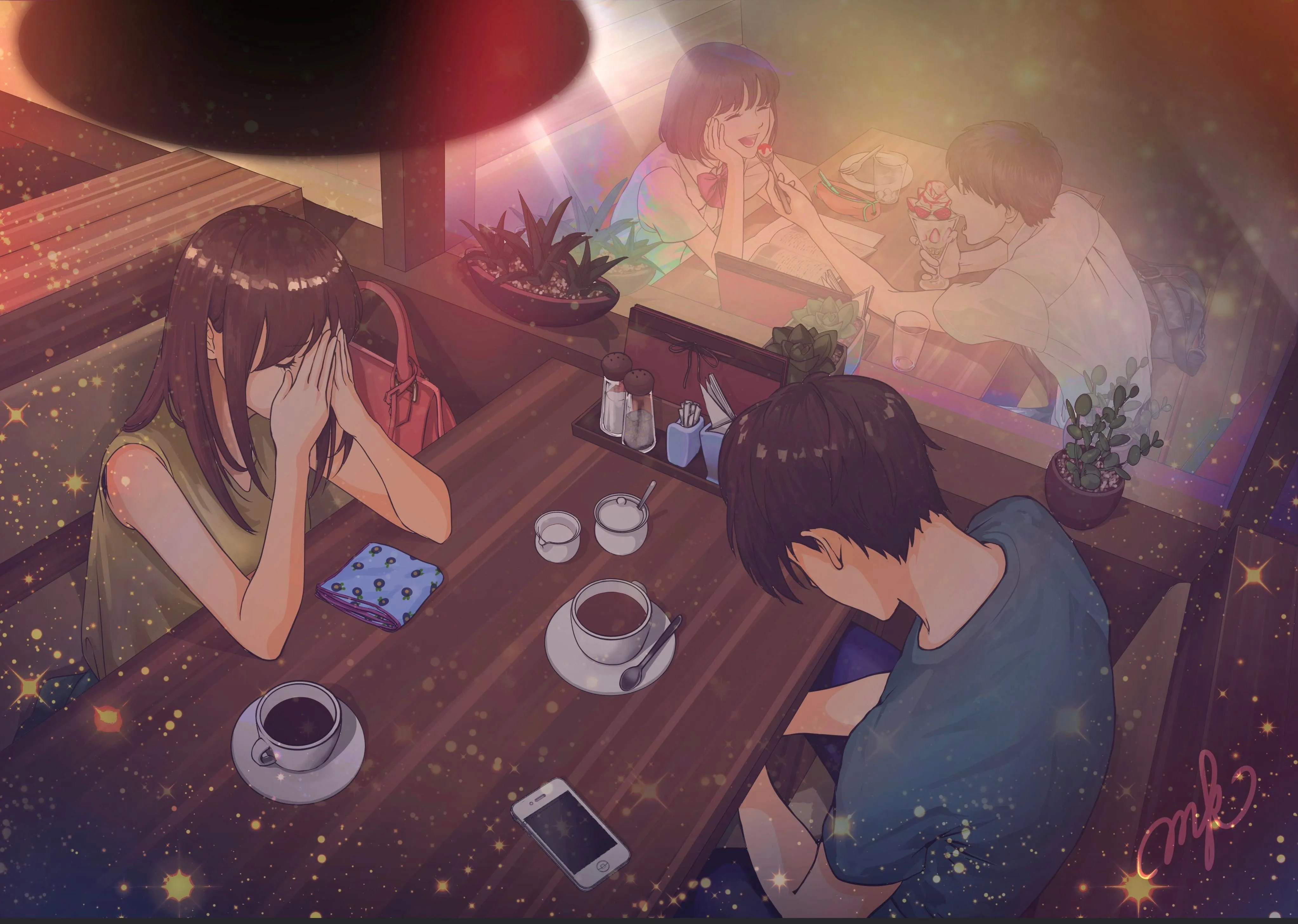 情侣 坐着 动漫 咖啡馆 悲伤 吃饭 餐馆 女孩 男孩 杯子 智能手机 4k壁纸