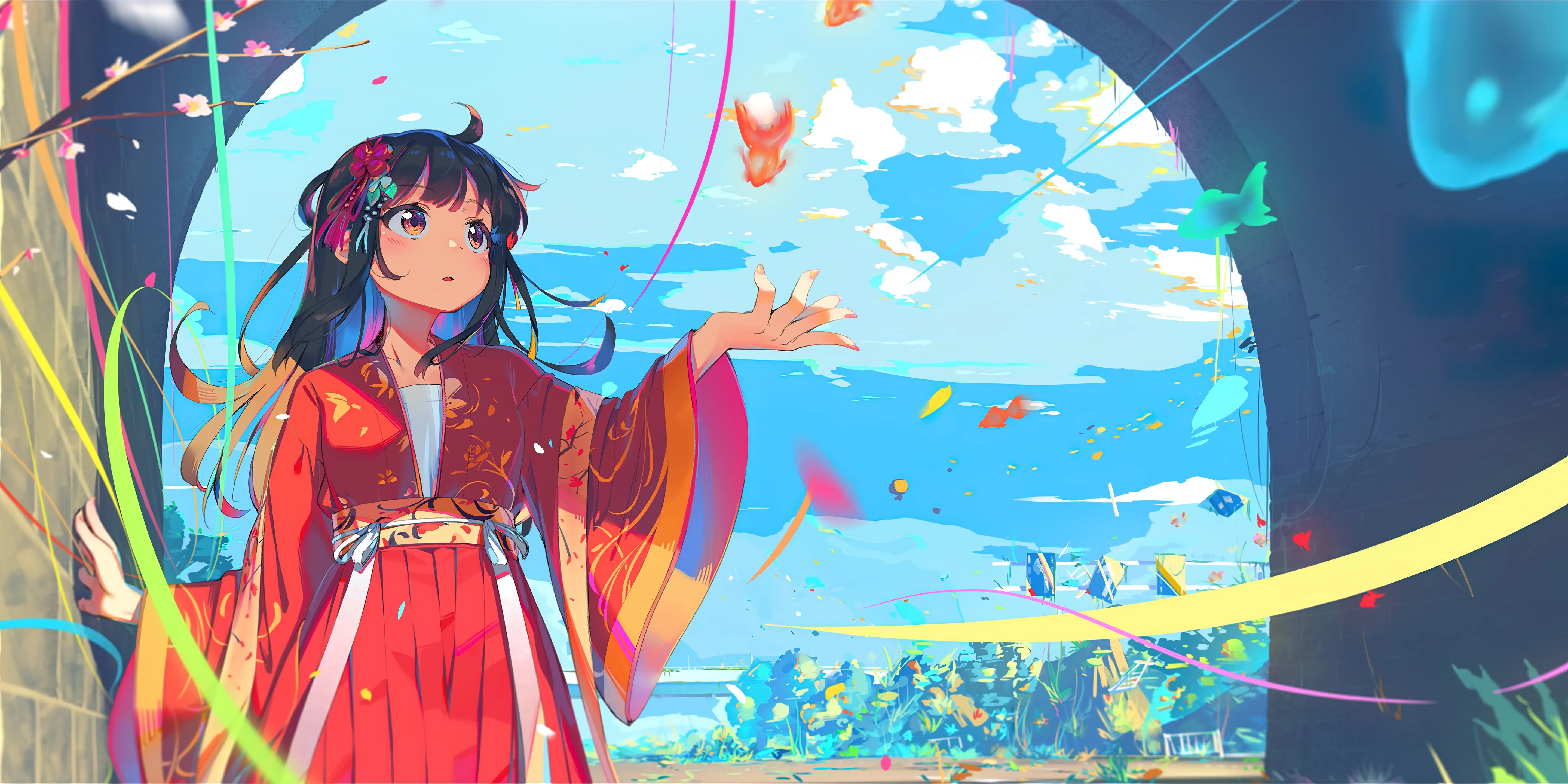 动漫 女孩 AI艺术 传统服装 汉服 花瓣 鱼 4k壁纸