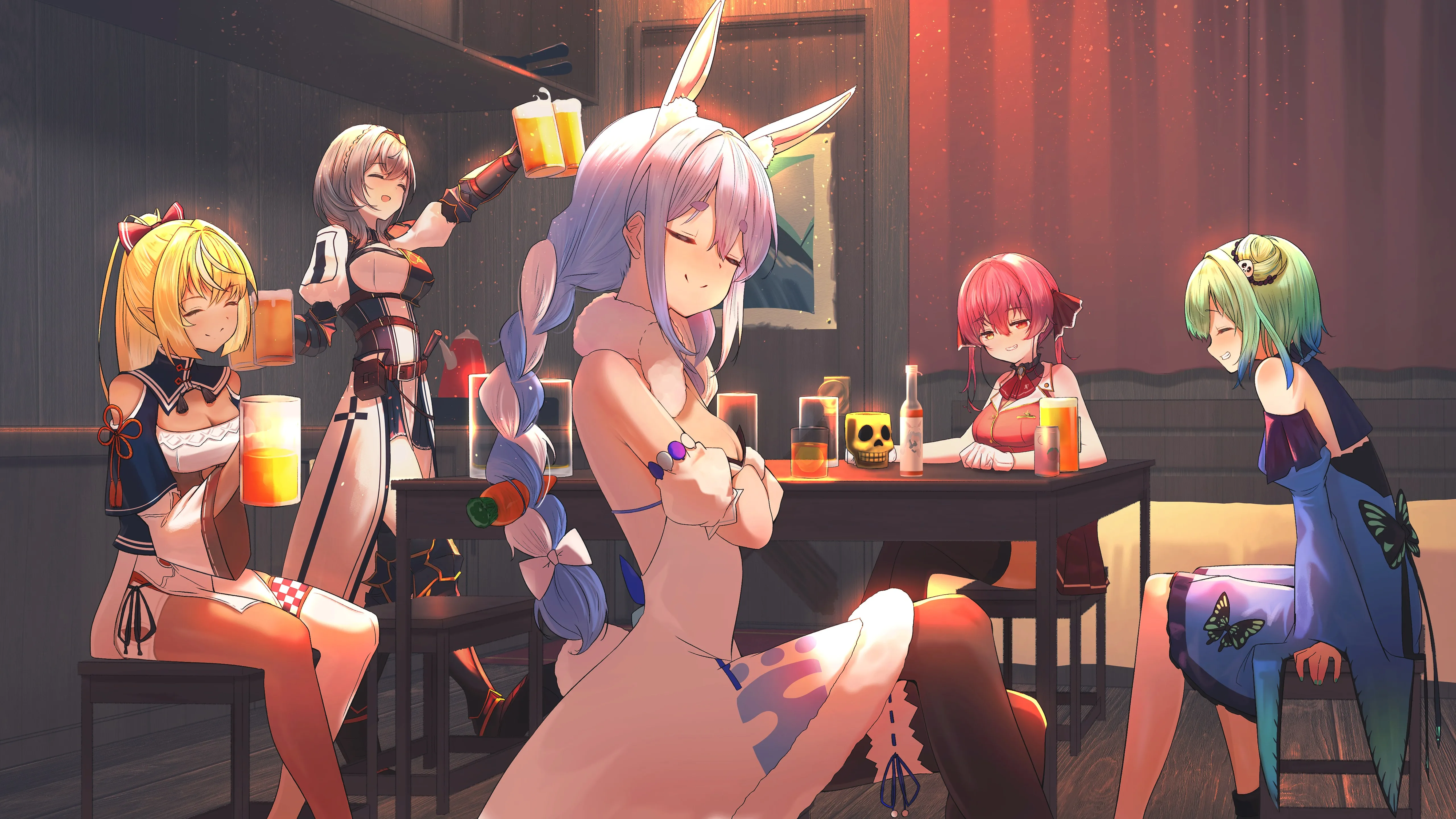 醉酒 海军 陆战队 团体 交叉腿 室内 女性 动漫 女孩 异瞳 酒馆 啤酒 虚拟 4k壁纸