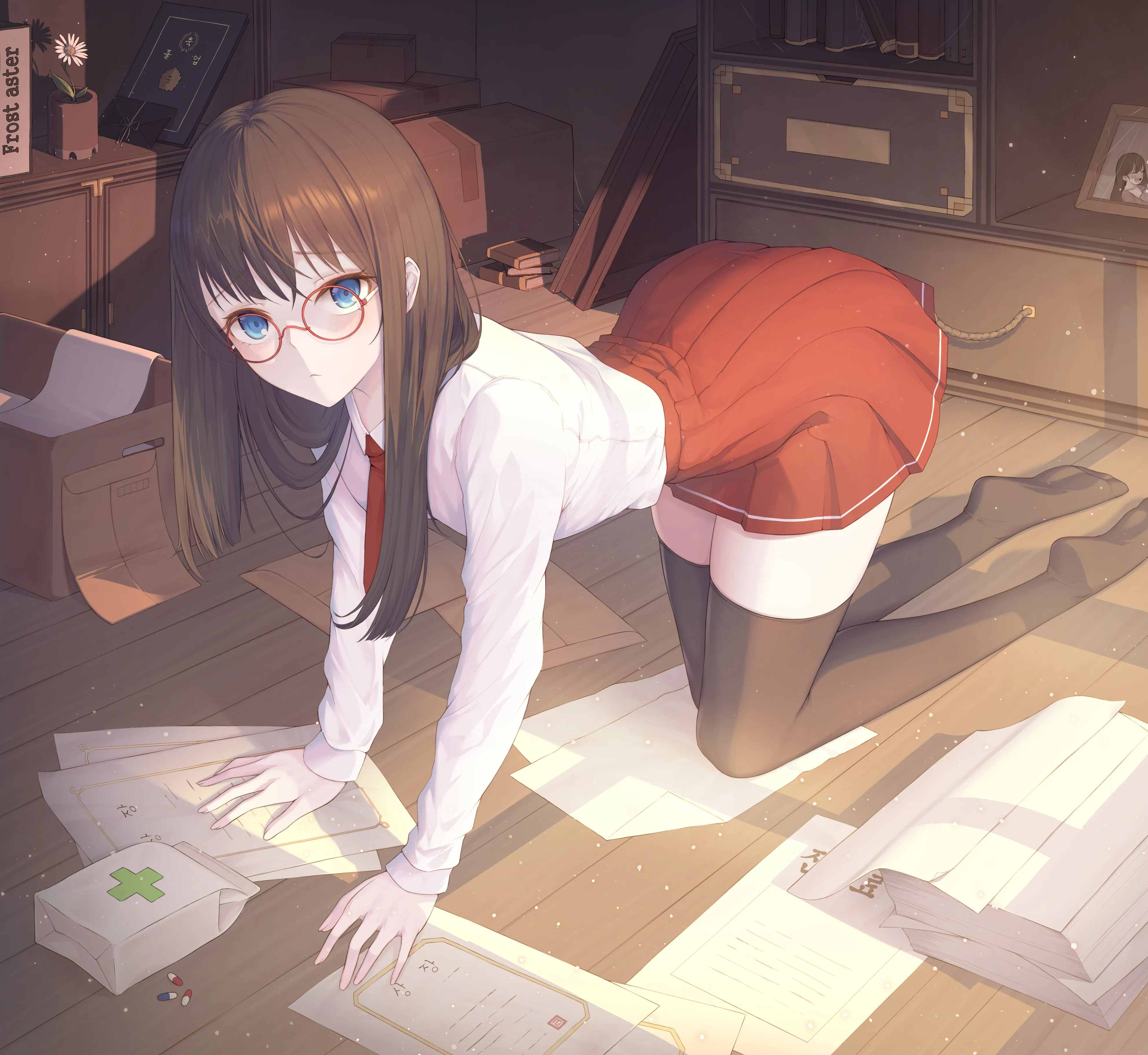 弯腰 黑发 长发 蓝眼睛 AI艺术 动漫 女孩 眼镜 皱眉 白衬衫 红裙子 校服 4k壁纸