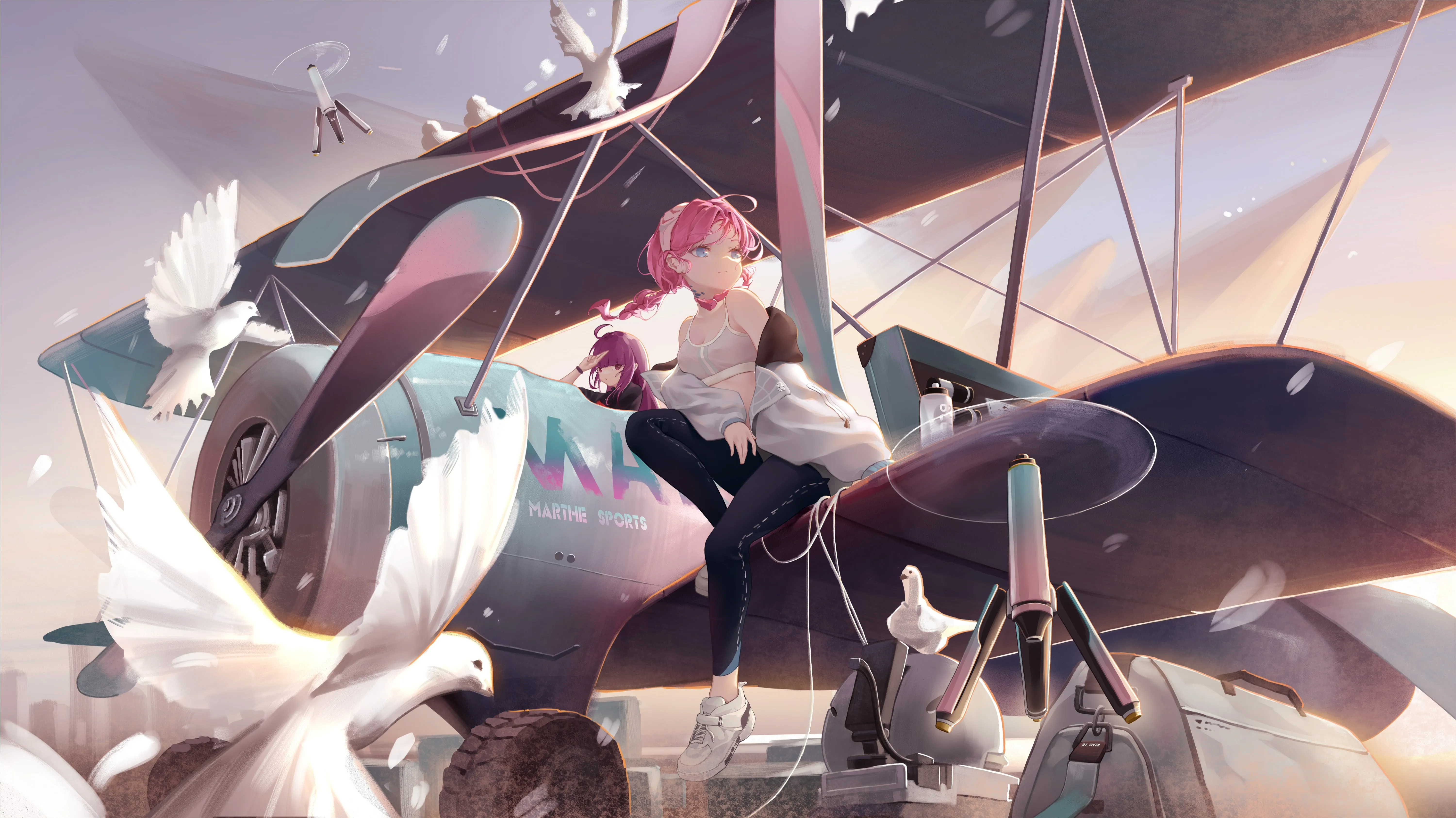 粉红色头发 动漫 女孩 AI艺术 肖像 明日方舟 飞机 鸽子 和平鸽 飞机 4k壁纸