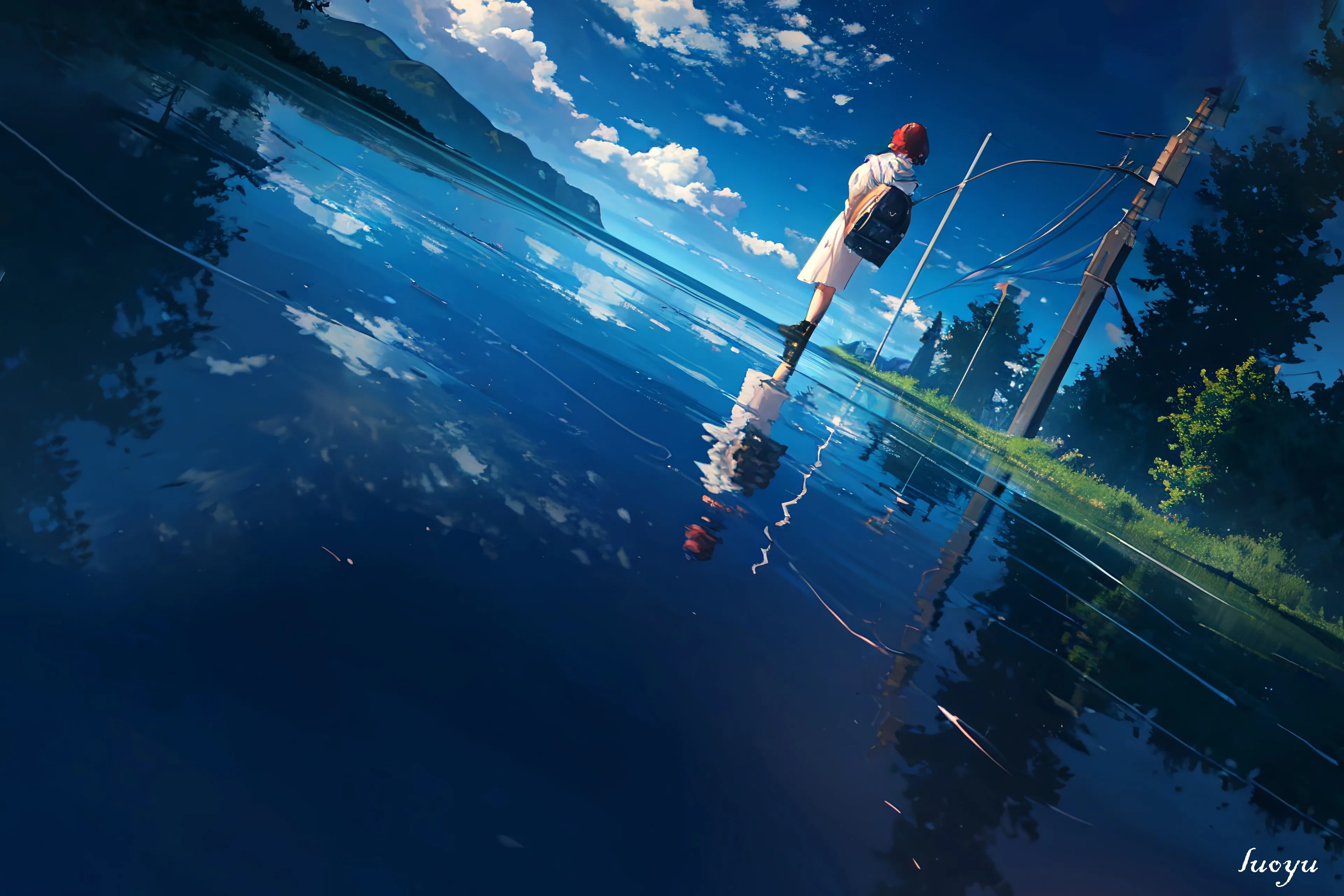 洛羽 站立 短发 户外 女性 动漫 女孩 风景 云 倒影 背包 树木 天空 水 4k壁纸