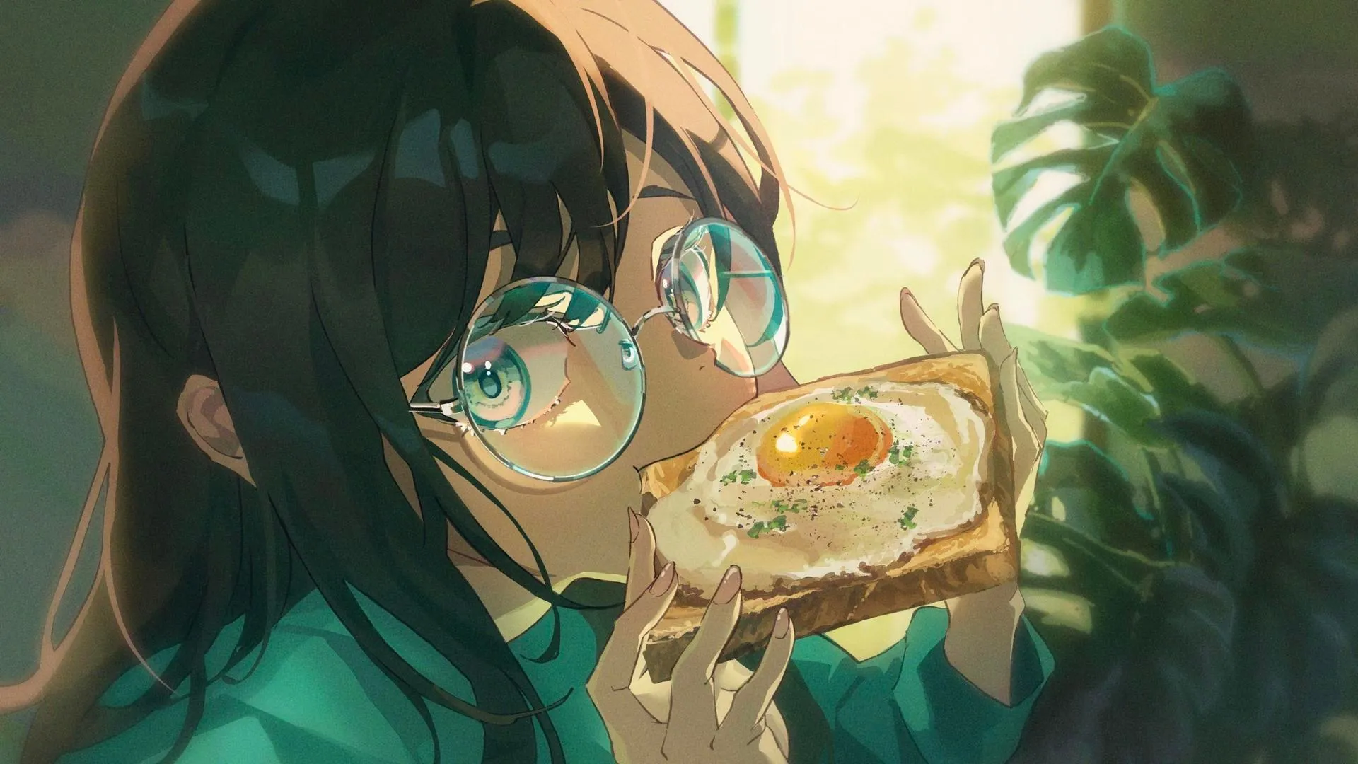 戴眼镜的女人 蓝眼睛 动漫 动漫女孩 吐司 动漫女孩吃 吃 鸡蛋 眼镜 植物