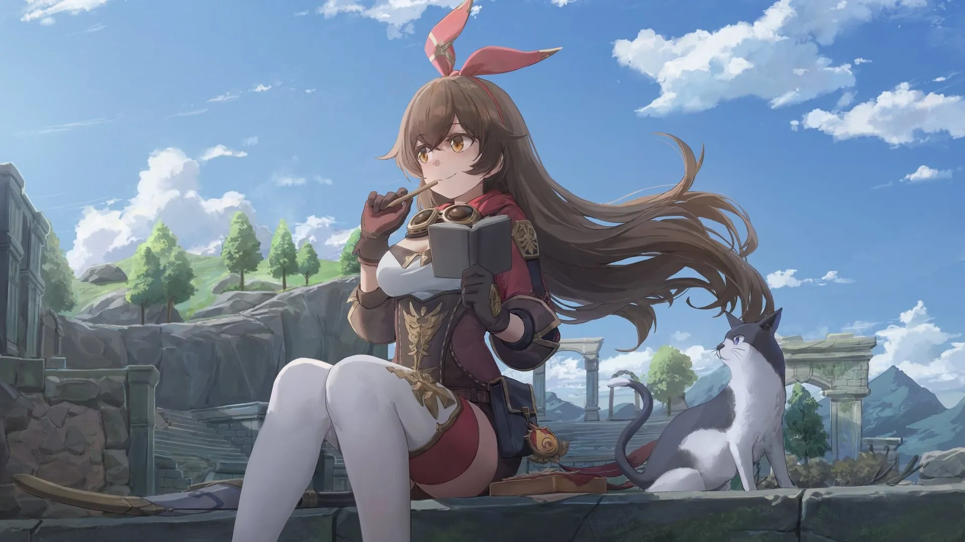 坐着 黑发 长发 原神 琥珀 原神 动漫女孩 棕色眼睛 猫  桌面壁纸 4k壁纸
