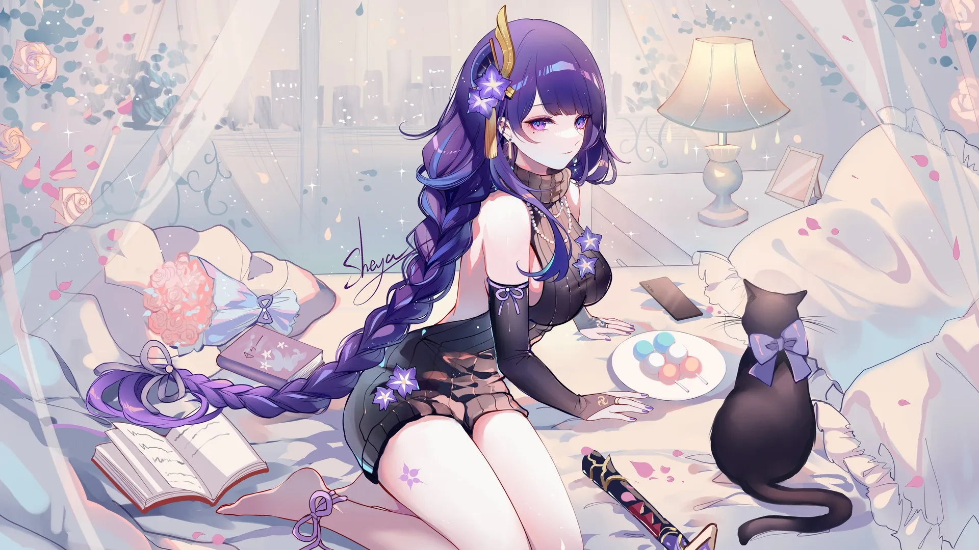 在床上 眼下有痣 双腿并拢 跪着 长发 紫色头发  桌面壁纸 4k壁纸