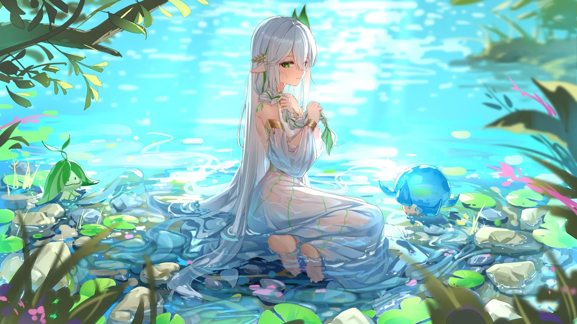 白发 长发 动漫 动漫女孩 连衣裙 水  电脑贴纸 8 K贴纸