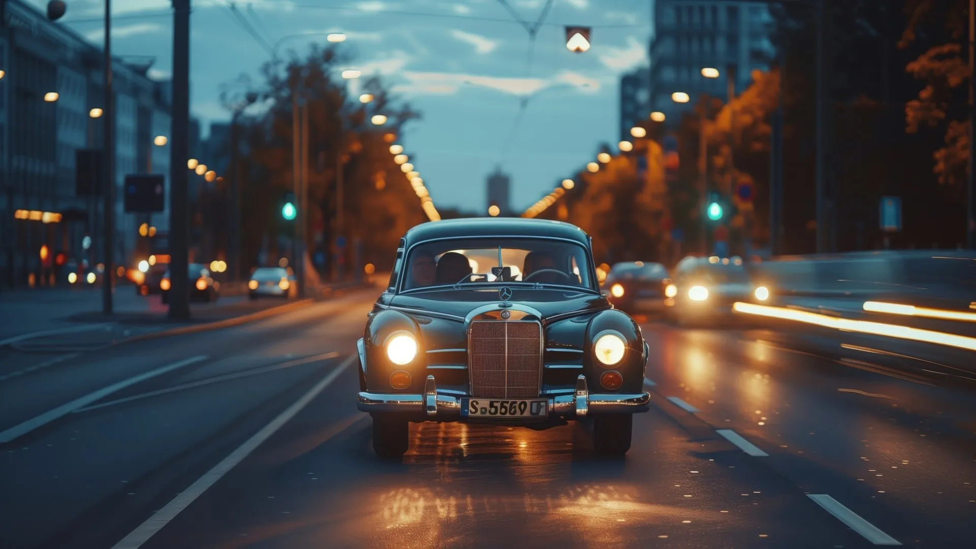 奔驰 复古车 黄昏 驾驶 前灯  电脑贴纸 4K贴纸