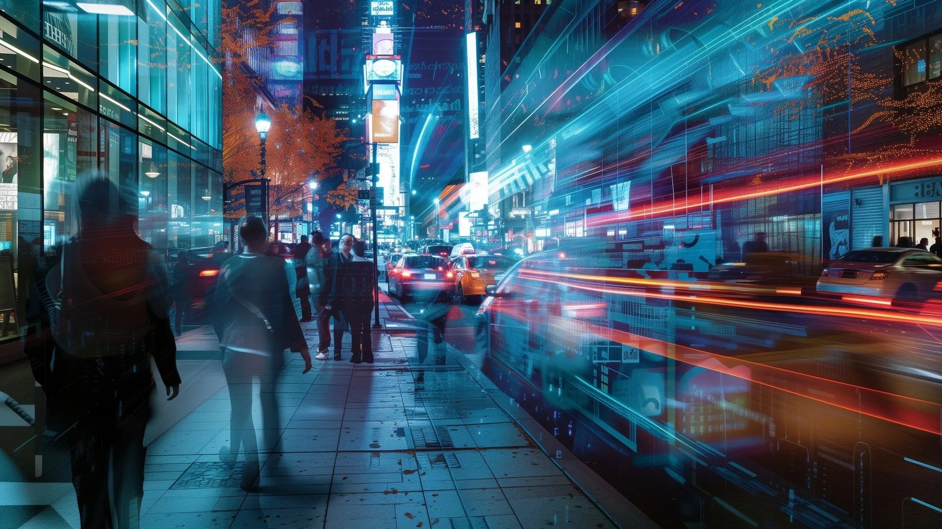 AI艺术 城市 街道 长长的走廊 人行道 繁忙的街道 夜晚 桌面壁纸 4k壁纸
