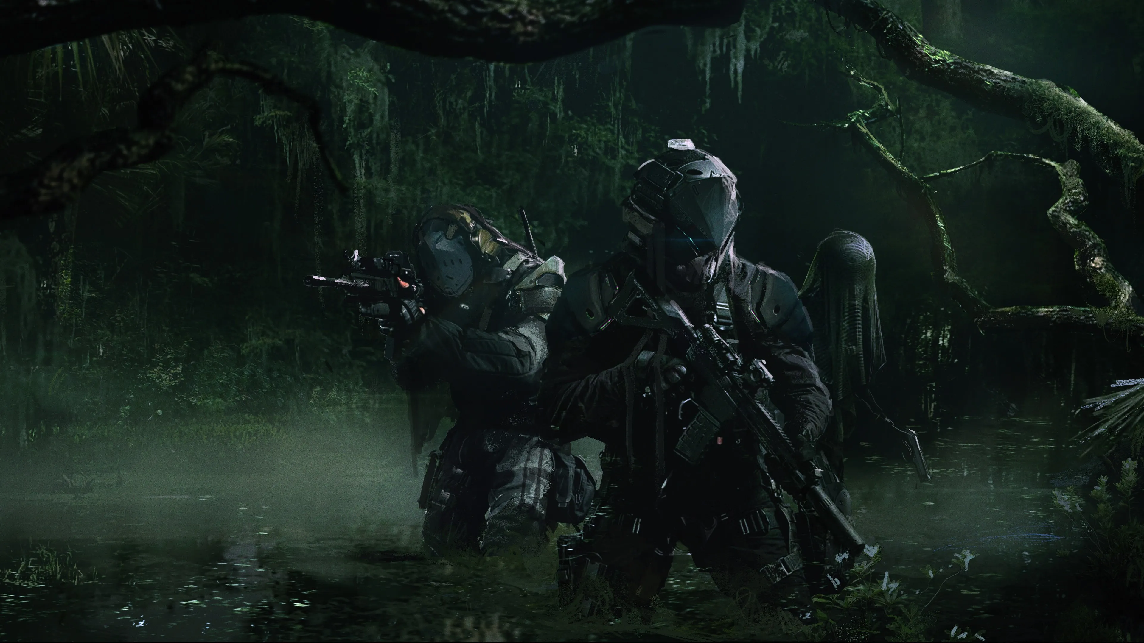 游戏CG人物 侦察 装甲 沼泽 突击步枪 灌木丛  4k壁纸