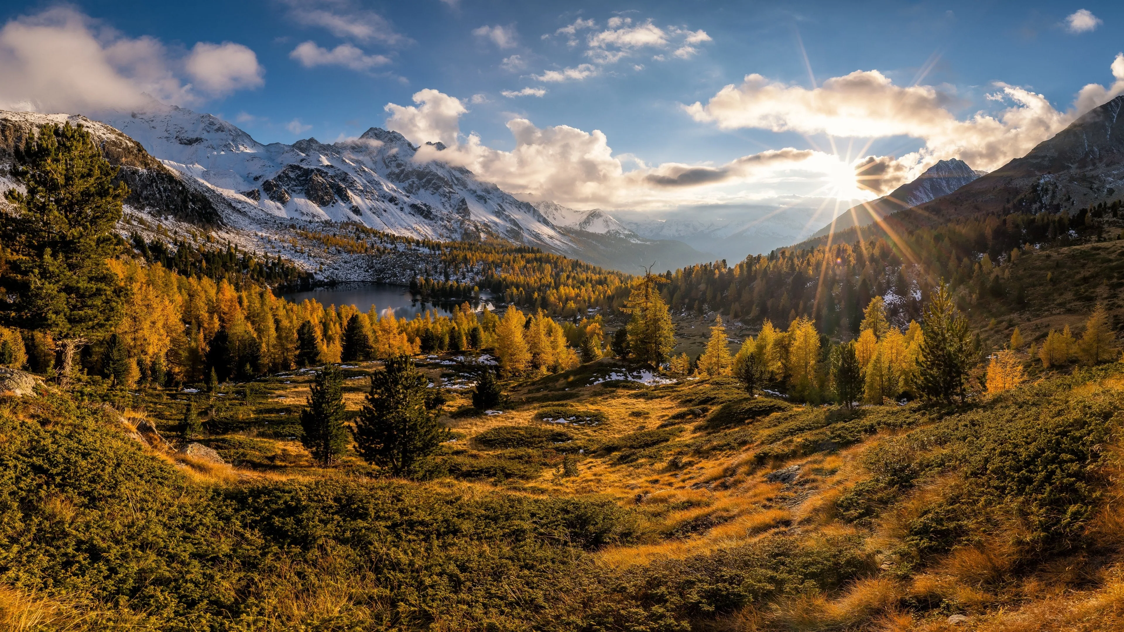 自然 风景 秋天 日落 太阳 山脉 雪 天空 云 树 森林 湖泊 水 阳光  电脑壁纸 4k壁纸